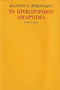 ΤΟ ΠΡΟΠΑΤΟΡΙΚΟΝ ΑΜΑΡΤΗΜΑ -ΙΩΑΝΝΟΥ ΡΩΜΑΝΙΔΟΥ (ΔΟΜΟΣ 2001). Το παρόν δοκίμιον αποτελεί συνέχειαν και ανάπτυξιν του άρθρου ημών Original Sin According to St. Paul, δημοσιευθέντος τω 1995 εν τω περιοδικώ “St. Vladimir’s Seminary Quarterly”, σκοπόν δε κυρίως έχει την έρευναν των δογματικών προϋποθέσεων αυτών προς την καθ’ όλου κατεύθυνσιν της περί δόγματος και ηθικής αντιλήψεως της Ορθοδόξου και της Δυτικής Εκκλησίας, επί τω τέλει όπως υποδειχθούν σημειά τινά εις τα οποία παρεξέκλινεν η Δύσις εκ της διδασκαλίας της αρχαίας Εκκλησίας. 185 σελ. 10€